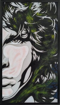 “People Are Strange (Homage)” è un’opera che nasce come tributo ai Doors e al loro celebre brano del 1967. Il volto enigmatico che domina la scena si trasforma sotto l’effetto della luce: spento, rivela texture materiche e pennellate cromatiche; acceso, si accende di un bagliore dato dai led multicolor che ne stravolge i tratti e ne amplifica l’intensità.