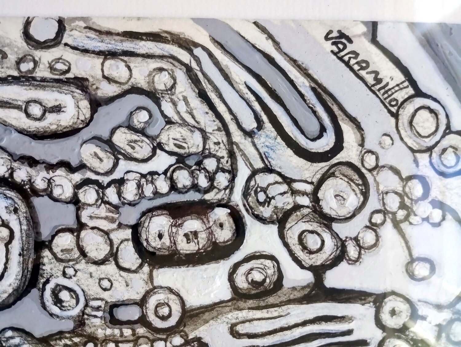 Unendo l'astrazione a delicate allusioni figurative, Jaramillo costruisce composizioni stratificate che evocano luoghi, atmosfere e mutevoli stati dell'essere. Il suo uso di gesti intuitivi e di colori attentamente bilanciati crea strutture visive ritmiche che trasmettono un senso di espansività e intimità.