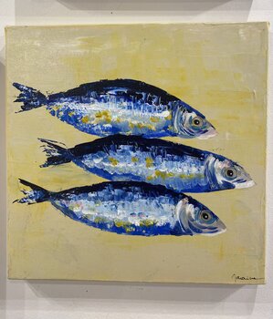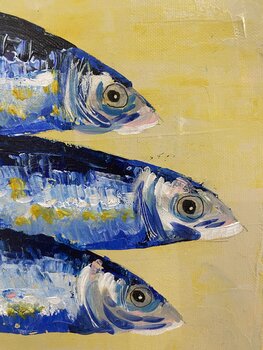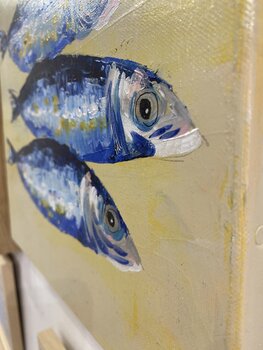 La lavorazione è eseguita a coltello su fondo lavorato in trasparenza, i pesci presentano quindi un rilievo molto interessante. I lati sono ben dipinti in modo da non dover incorniciare la tela.