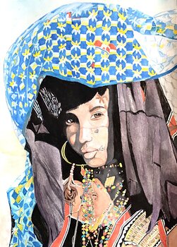 Questo acquerello si propone di catturare la profondità e l'eleganza di una cultura intrisa di storia e vita. Ogni dettaglio realistico riflette la forza e la serenità del soggetto, avvolgendolo in un'aura di mistero e bellezza. Il mistero e il magnetismo intrinseci alla cultura africana.