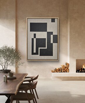 Opera dipinta in acrilico nero su tessuto di lino grezzo e cornice galleggiante in legno di quercia.