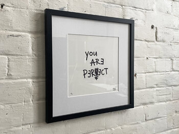 Su questa stampa, il testo recita YOU ARE PERFECT. In origine, PERFECT era scritto erroneamente come PERVECT. La V è stata cancellata e posizionata ordinatamente sotto la F. Una sottile celebrazione delle imperfezioni e dell'accettazione dei piccoli errori come parte della bellezza.