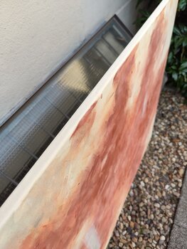 "Chiudi gli occhi e sentilo immobile" evoca il turbinio delle foglie autunnali, una tempesta di sabbia al tramonto, un cielo serale tinto di rosso. La texture marmorizzata e i colori intensi, che interagiscono con gli elementi spruzzati e punteggiati, creano un effetto unico e profondo. Se ci si lascia trasportare dall'opera, essa suscita al tempo stesso inquietudine e serenità. Una miscela davvero unica.