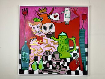 "Regina di Cuori" è un vibrante dipinto acrilico su tela in stile pop art, una sorta di fiaba moderna nei toni del rosa e del rosso, ma con un nucleo molto quotidiano. Al centro si trovano una mucca incoronata e una tigre al suo fianco: due figure potenti che insieme irradiano protezione, orgoglio e umorismo.