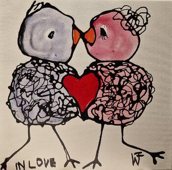 Nelle mie opere d'arte ho tradotto passione e innocenza in colori vibranti e forme figurative ingenue. Utilizzando l'acrilico, ho creato due creature che, se abbracciate con un tocco gentile, irradiano sentimenti di calore e affetto. I loro cuori si uniscono per formare uno splendente simbolo d'amore. Questo dipinto è una confessione d'amore nella sua forma pura e porta energia e gioia in ogni casa.