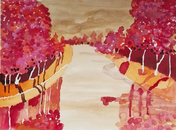 In questo acquerello, catturo l'incanto di una riva di fiume in autunno. I rossi e gli arancioni vibranti riflettono un'atmosfera calda, quasi magica. Lo stile semi-astratto invita a vivere la natura con il cuore aperto e dona energia e armonia a qualsiasi spazio. Quest'opera intende trasmettere tranquillità e gioia.