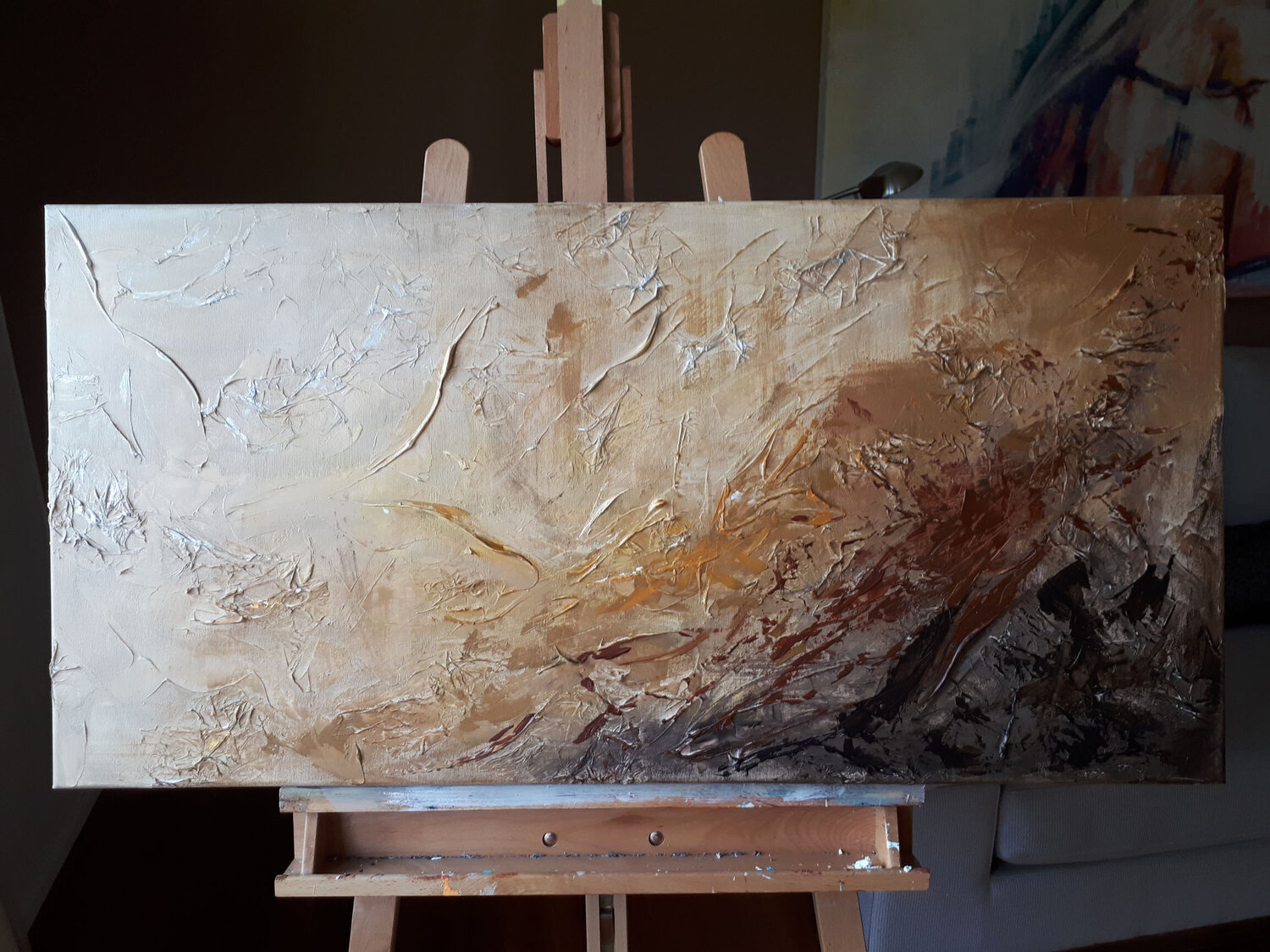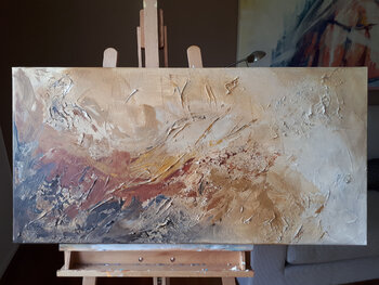 Dittico. In quest'opera, ho cercato di catturare la dualità interiore dell'essere: luce e ombra, caos e calma. Ho usato acrilico e gesso per creare texture che invitano al tatto, a percepire ogni strato di emozione. È un viaggio astratto, un invito a perdersi e ritrovarsi allo stesso tempo, riempiendo ogni spazio di un'energia calda e profonda che risveglia l'introspezione.