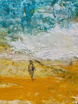Campiture luminose di azzurri e turchesi si intrecciano a materie dense e stratificate; la superficie si anima di tracce, segni e velature che suggeriscono un tempo lento, quasi… geologico. Le figure, appena accennate, attraversano lo spazio con leggerezza, come presenze silenziose immerse in un paesaggio interiore.