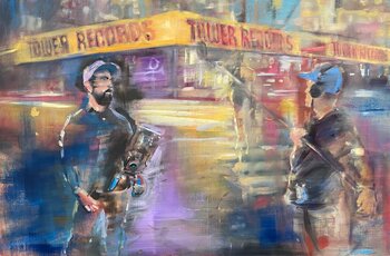 C'è qualcosa di speciale in una notte di pioggia a Los Angeles. Nel mio dipinto a olio su lino "Sound and Vision (Sunset Boulevard - Tower Records)", una troupe cinematografica si prepara per la ripresa successiva, lavorando in team nell'arte collaborativa del cinema. Il direttore della fotografia impugna una videocamera digitale leggera, adatta a una produzione indipendente discreta, mentre il tecnico del suono prepara il microfono a braccio. Le… ruote sfrecciano nella nebbia, mentre la Tower Records richiama il passato. La pubblicità di un album di Prince si illumina di viola sotto la pioggia. La storia di Los Angeles e l'arte cinematografica si fondono.