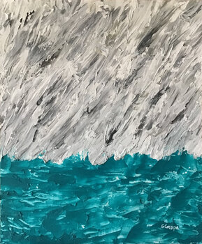 Dipinto semiastratto di un paesaggio marino islandese. Mostra un grande iceberg sopra il mare. L'artista utilizza una miscela di pittura ad olio con cera fredda per evidenziare le diverse texture del blocco di ghiaccio e del mare. C'è anche un grande contrasto tra il ghiaccio bianco e grigio con l'acqua turchese.