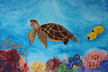 Nel mio dipinto ho catturato la tranquilla bellezza e i meravigliosi colori dell'oceano, portati in vita attraverso l'uso di colori acrilici nello stile del realismo. Una tartaruga marina, maestosa e leggiadra, scivola tra le acque cristalline accompagnata da un pesce dal colore giallo brillante. Questo lavoro mira a celebrare le meraviglie della vita marina ed evidenziare la fragilità dei nostri oceani. Porta un messaggio di protezione e ammirazione… in ogni casa, riempiendo la stanza con un'energia calma ma potente.
