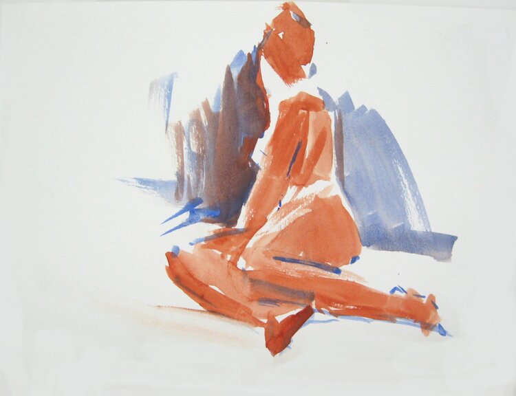 Questo piccolo schizzo cattura un momento di movimento silenzioso: una donna siede con i capelli raccolti, voltandosi dall'altra parte, ma allo stesso tempo rivolta verso qualcosa di nuovo. Le pennellate sciolte nei toni del rosso caldo e del blu freddo conferiscono alla figura una vibrante tensione tra calma e apertura. È un'immagine che riempie gli spazi di leggerezza e cattura continuamente lo sguardo dell'osservatore.