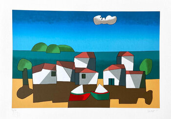 In questa serigrafia, ho catturato l'essenza serena di un umile villaggio di pescatori. Le forme audaci e stilizzate sfruttano la semplicità della vita in riva al mare, dove prevale l'armonia con la natura. I vividi blu dell'oceano contrastano elegantemente con i toni terrosi della terra, invitando un'influenza calmante in ogni casa. Questa opera d'arte simboleggia la tranquillità e un ritorno alle origini, ideale per portare un'energia dolce e pacifica… nel tuo spazio abitativo.