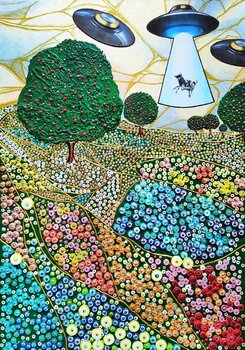 Ma guardate il cielo. Lì, tra il delicato azzurro e le nuvole perlacee, si dispiega un quadro completamente diverso. Realistici dischi UFO metallici, come monete argentate, solcano il cielo. Contrastano con lo splendore decorativo del giardino, creando un netto contrasto che evoca un leggero senso di smarrimento e allo stesso tempo stimola l'immaginazione. E ora, uno di questi oggetti misteriosi, come un gigantesco aspirapolvere, sta trainando... una mucca.
