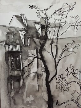 In questo lavoro mi sono ispirato alla bellezza effimera dell'architettura antica, che ho catturato utilizzando la tecnica dell'inchiostro. Le linee fluide e impressionistiche dell'albero contro la durezza strutturata dell'edificio riflettono la coesistenza della natura e della creazione umana. È un omaggio a ciò che… perdura e muore allo stesso tempo, conferendo a questo disegno un'atmosfera profonda, quasi malinconica. Porta un'energia nostalgica in ogni stanza, una riflessione sul tempo stesso.