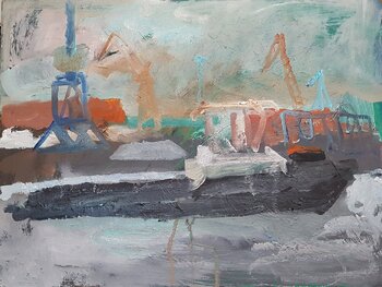 Studio… all'aperto del porto di Pietroburgo con gru, espressionismo, colori molto vivaci. Olio su cartone.