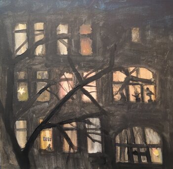 In questo dipinto ho cercato di catturare l'atmosfera di una tarda serata in città, dove solo le finestre illuminate mostrano la vita sullo sfondo scuro e inflessibile della facciata dell'edificio. Per me queste finestre rappresentano piccoli spiragli… di speranza in un mondo che spesso sembra freddo e inospitale. Utilizzando colori acrilici ed elementi dell'espressionismo e dell'impressionismo, ho creato un'atmosfera che stimola la riflessione e irradia calore. Quest'opera d'arte ha lo scopo di risvegliare nello spettatore un sentimento di stretta connessione e silenziosa consolazione.