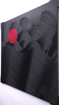 Nel creare questo pezzo, ho incanalato le emozioni tumultuose e la serenità contrastante che spesso sperimentiamo nella vita. Gli ampi tratti neri evocano un senso di onde travolgenti o nuvole tempestose, armoniosamente interrotte da una sfera vivida e infuocata. Questo cerchio rappresenta un faro o un occhio, un nucleo di calma o intuizione nel caos. Quest'opera d'arte incarna le lotte e i momenti di chiarezza della vita, portando una profonda vivacità… emotiva e visiva in ogni spazio.