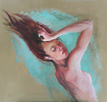 L'intensità di un momento sospeso, tra sogno e realtà. Tonalità calde e fredde dialogano per esprimere la tensione emotiva e la fragile tenerezza del momento. Questo dipinto evoca un'energia vibrante e intima, invitandoci a percepire l'intreccio di libertà e vulnerabilità in un esaltante respiro di vita.