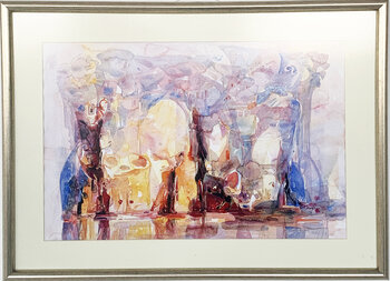 "Concerti nella Vecchia Plovdiv I" è un acquerello lirico che unisce architettura, memoria e musica. Fluenti pennellate di viola, blu e ambra permettono a figure, archi e facciate di fondersi nell'atmosfera, riflettendo l'armonia transitoria del momento. L'opera raffigura non solo un luogo, ma un'esperienza: un concerto astratto in cui città, storia e melodia si fondono.