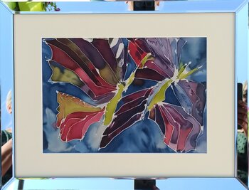 Le forme dei fiori sono per me la calligrafia della natura - la ricchezza di forme e colori. I fiori nelle mie interpretazioni pittoriche sono forme ispirate alla natura, ma estratte dall'apparente caos di macchie e strutture colorate. Questo dipinto è stato ispirato dalle forme e dai colori degli iris che diventano farfalle nella mia pittura. Il dipinto della serie Flower Power è realizzato con la tecnica della pittura su seta. Questa tecnica rispecchia… appieno la delicatezza e la fluidità dei fiori in natura. Questo dipinto è incorniciato in una cornice a specchio. Formato quadro nella cornice: 34x44 cm