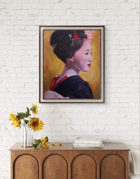 In questo dipinto a olio, catturo la grazia serena di una geisha, avvolta in un'aura dorata che irradia calore e mistero. Le mie pennellate in stili figurativi, impressionistici e realistici si fondono per evidenziare il suo delicato portamento e le sottili complessità della sua espressione. Questa opera d'arte invita alla contemplazione, aggiungendo un tocco di eleganza senza tempo e ricchezza culturale a qualsiasi spazio che abbellisce.