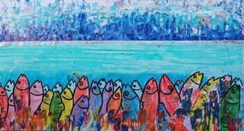 Nel mio lavoro combino colori vibranti e figure vibranti per creare una scena energica. Questa immagine mostra una serie di pesci colorati, simili a cartoni animati, che lottano verso un futuro sconosciuto. Voglio dare agli spettatori una sensazione di ottimismo e libertà. I toni audaci e l'elemento umoristico porteranno energia vibrante e un sorriso in ogni stanza.