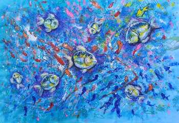 In questo lavoro, che ho realizzato con acrilico e pastello a olio, approfondisco le incognite e i segreti del mare. Il mix dinamico di stile astratto e futuristico cattura un mondo pieno di vita e movimento. I pesci, circondati da vivaci forme e colori fluttuanti, rappresentano il variegato e incantato mondo sottomarino. Questo dipinto porta un'energia tonificante e colorata in ogni casa, un simbolo costante delle meraviglie del mare.