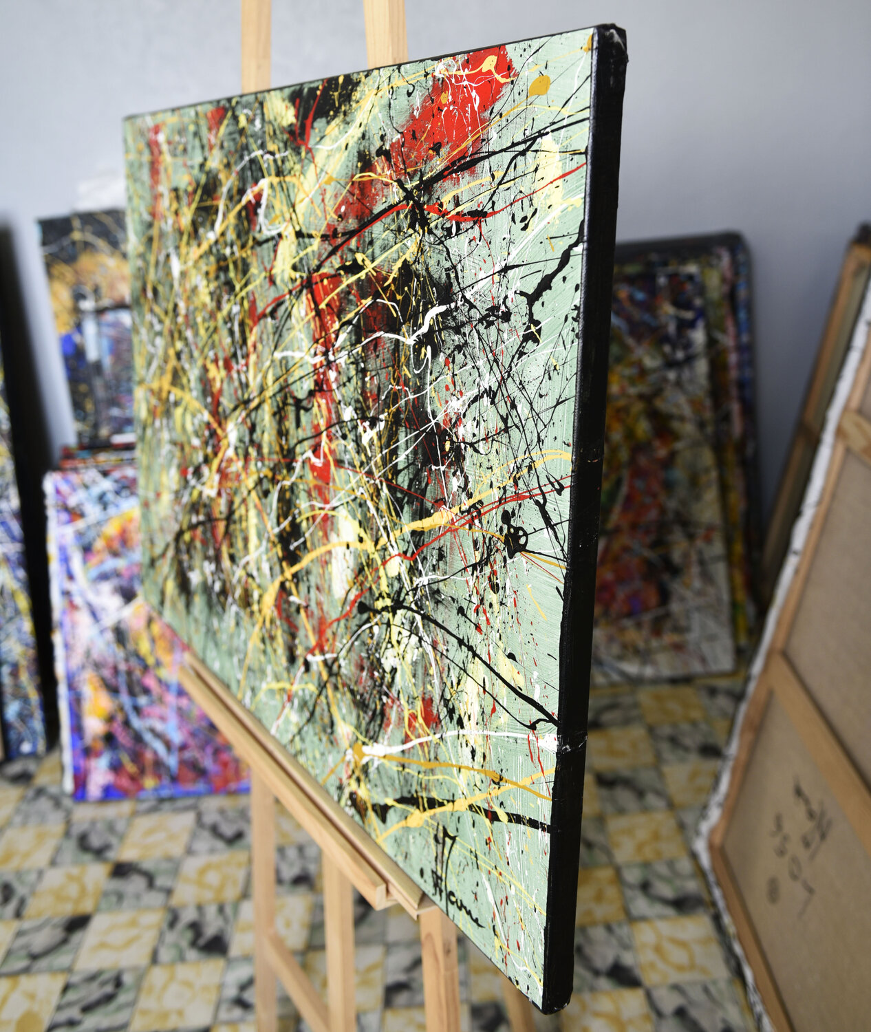 In quest'opera della serie A, lavoro sull'intensità del gesto e sulla spontaneità dell'applicazione. La pittura esplode sulla superficie in linee, esplosioni e traiettorie di colore, e ogni segno conserva l'energia del movimento che lo ha generato. La tela diventa così uno spazio d'azione in cui gesto e materia dialogano liberamente.