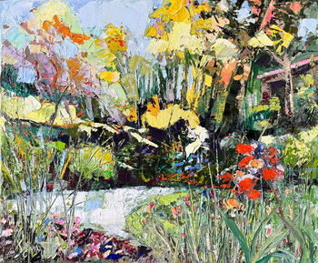 Quest'opera è stata dipinta catturando le vibrazioni del mio giardino in piena fioritura. Colpi di spatola