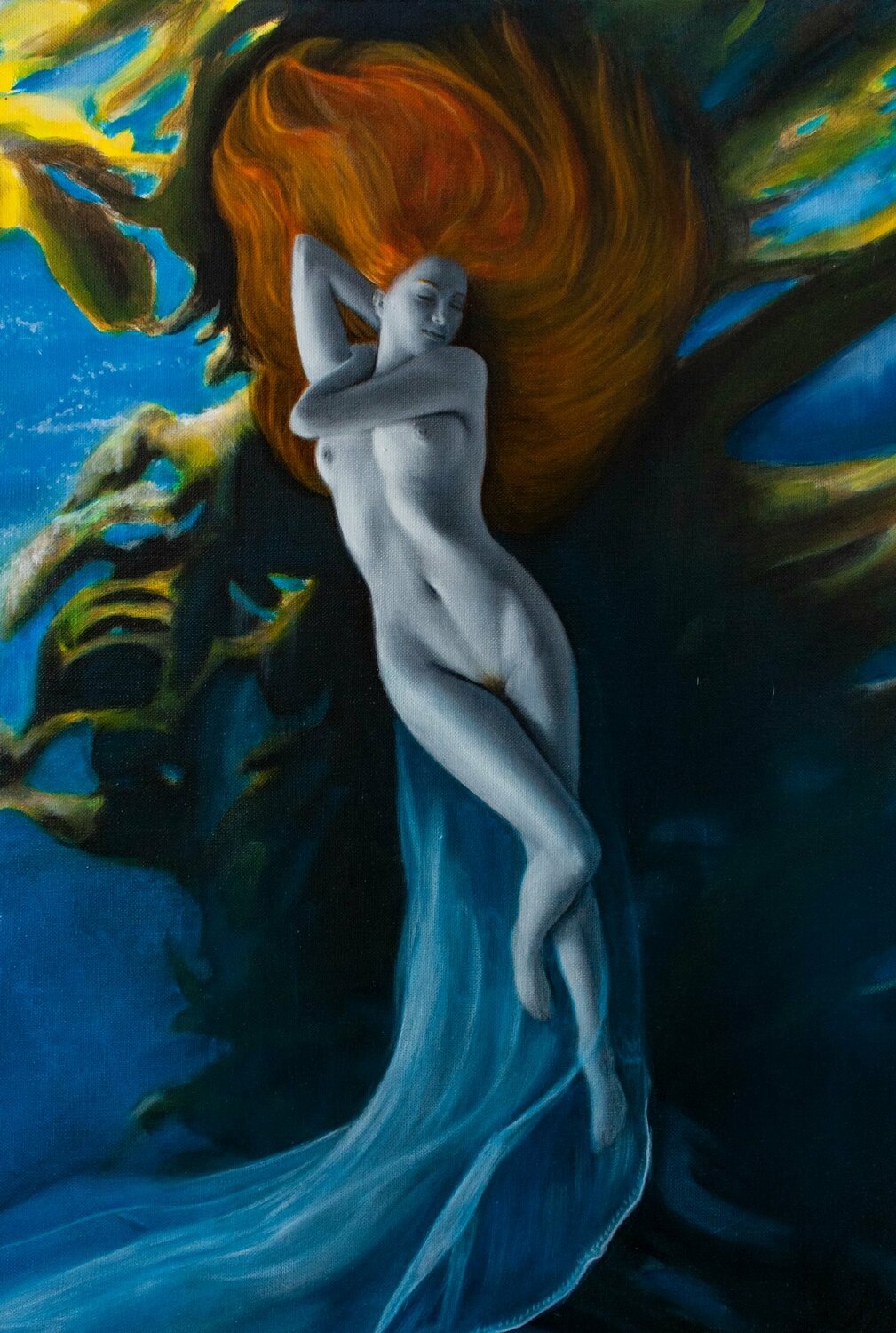 Il suo lungo strascico di pizzo, come una medusa, pulsa con la volontà delle correnti.