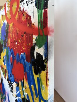 Questo pezzo è stato realizzato insieme ad altri due. Era un tris realizzato contemporaneamente. Per me assomigliano a un giardino di segni. C'è qualcosa di floreale in ognuno di essi. Non era nelle intenzioni, ma affidandoci al processo creativo, ci siamo ritrovati in una bellezza caotica di colori.