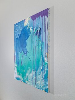 Mentre iniziavo a dipingere Melting Skies quella sera, rimasi fuori a guardare l'orizzonte che si disperdeva. I blu non si fondevano: si spingevano l'uno contro l'altro, netti e insistenti, mentre strisce bianche si facevano strada come pensieri irrequieti. Dentro di me, provavo la stessa sensazione: emozioni che si scontravano invece di allinearsi, come fronti temporaleschi che si rifiutavano di placarsi.