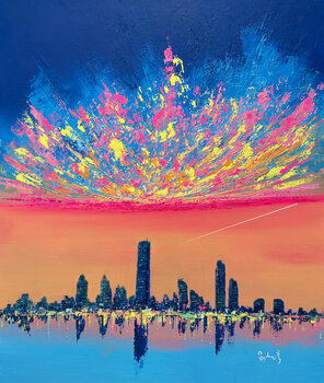 L'opera riflette il momento in cui il cielo si dissolve in colori radiosi e la città si apre in un vasto panorama.