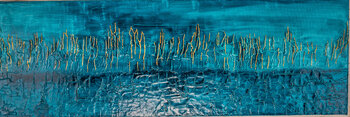 Quest'opera riflette la mia passione per le profondità misteriose, fondendo acrilico e doratura per evocare un mondo astratto in cui la luce danza su acque calme. Volevo catturare un'energia rilassante e ipnotica, come un vibrante viaggio interiore, che invitasse alla meditazione e alla fantasticheria nello spazio.