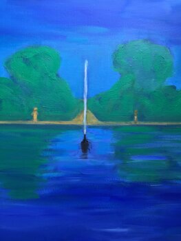 In questo dipinto a olio, ho riversato il mio fascino per la luce e il riflesso in una tela di vibrante evasione. Caratterizzato da un espressionismo audace e dal fascino figurativo, è un mondo semi-astratto in cui la contemplazione incontra il gioco dinamico del blu e del verde. La figura, assorta nella distesa serena, incarna l'introspezione. Non è solo un pezzo visivo; è un paesaggio emotivo, che offre un'energia tranquilla a ogni spazio che occupa.… Questo dipinto ad olio è stato ispirato dalla mia fotografia scattata a Parigi nei giardini delle Tuileries.