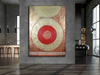 In quest'opera ho sperimentato forme astratte e geometriche. La combinazione di foglia d'oro, pittura e materiale di riempimento conferisce alla superficie una texture vibrante e un senso di metafisica. Irradia un potente simbolismo: un vero centro di ispirazione ed equilibrio per l'osservatore in cerca di tranquillità.