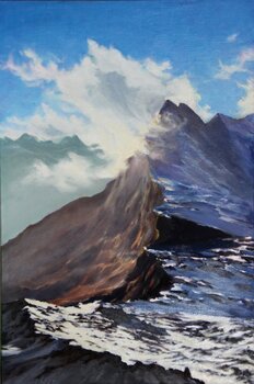 Questo dipinto cattura la maestosa potenza delle montagne, realizzate con colori a olio per lo più atossici.