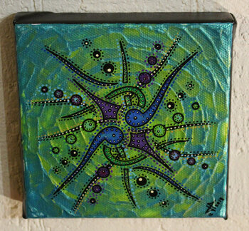 opere realizzate con un coltello con vernice acrilica (Pébéo-Studio) e Posca (Uni) su telai in legno ricoperti di cotone (100% cotone).