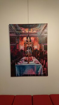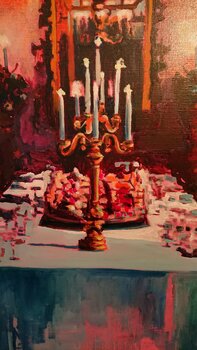 In questo dipinto a olio, ho catturato una stanza opulenta immersa in una luce drammatica, concentrandomi sul bagliore del lampadario e sul suo caldo riflesso sull'elegante tavolo sottostante. I tratti ricchi e strutturati evocano un senso di storia e grandezza, come se le pareti sussurrassero storie di serate passate. La sua presenza nella tua casa aggiungerà un tocco di raffinatezza senza tempo e un'aura di misteriose narrazioni tutte da scoprire.