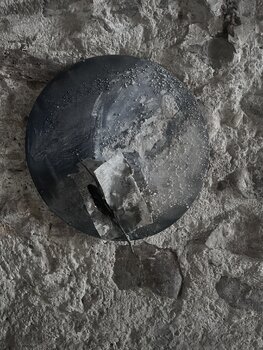 Dopo ogni fase del rituale, conservavo ciò che rimaneva: polvere, macchie, tracce, veli, i segni del contatto e del ritiro. Iniziai a trattare questi resti come un linguaggio. Il cerchio… apparve naturalmente, come un portale lunare, un'apertura che non conduce all'esterno, ma all'interno. Lavoravo per strati e cancellature, come se la memoria stessa si depositasse in superficie: neri come eclissi, bianchi come cenere, grigi come il tempo.