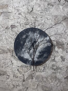 Dopo ogni fase del rituale, conservavo ciò che rimaneva: polvere, macchie, tracce, veli, i segni del contatto e del ritiro. Iniziai a trattare questi resti come un linguaggio. Il cerchio… apparve naturalmente, come un portale lunare, un'apertura che non conduce all'esterno, ma all'interno. Lavoravo per strati e cancellature, come se la memoria stessa si depositasse in superficie: neri come eclissi, bianchi come cenere, grigi come il tempo.