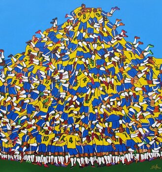 In questa vibrante opera, ho catturato l'energia estatica e lo spirito comunitario della celebrazione, ispirati dal dinamico mondo del calcio. Le innumerevoli figure, stratificate e intrecciate in una composizione quasi piramidale, rappresentano l'unità e la gioia condivisa. La loro impennata verso l'alto simboleggia l'impegno e il successo, riecheggiando i battiti pulsanti di innumerevoli fan. Questa opera d'arte esplode di colori e forme audaci,… portando un'ondata di esaltazione e ispirazione in qualsiasi spazio occupi.
