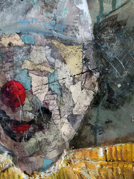 Intento trabajar in figura misterio que the envuelve, el silencio, la sonrisa, la tristeza y me lleva a the immaginación para utilizar el col·lage with diferentes materiales reciclados como el poso del café, the cartón of las hueveras to todo type de papeles reciclados, que le dan volumen a la obra.