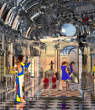 ALICE E LA REGINA DI CUORI LASCIANO IL LIBRO E GLI SPECCHI. IL CAPPELLO PAZZO NON MANCA