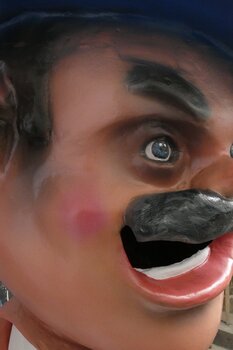 Scultura d'arte popolare di una grande testa, realizzata in cartapesta incollata, dipinta con aerografo e vernice acrilica.