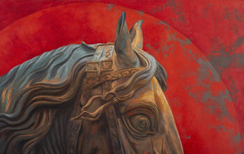 Cabeza de Caballo rappresenta una composizione unica dove la maestosità equina si fonde con l'estetica del metallo. In questo dipinto l'artista ha catturato la forza e la grazia del cavallo, presentandolo di profilo e trattando il colore con una squisita gamma di toni che imitano il bronzo. Il cavallo, incorniciato in un cerchio che si adatta quasi perfettamente al formato quadrato della tela, acquisisce l'intento di un medaglione, invitando lo spettatore… a contemplarne la nobiltà e la potenza. La tecnica utilizzata per creare l'effetto metallo bronzato è meticolosa, ottenendo un aspetto realistico e accattivante. Lo sfondo, colorato nei toni del rosso con scintillii evidenziati da smalti, circonda il cerchio che contiene la testa del cavallo. Questi toni rossastri, leggermente più chiari rispetto allo sfondo, forniscono una qualità pittorica che arricchisce l'opera, offrendo contrasti visivi e trame che invitano a esplorare ogni dettaglio.