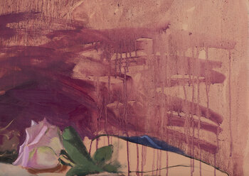 In questa affascinante opera, il pittore ci trasporta in un momento di serenità e contemplazione attraverso il suo studio di una donna distesa. La figura centrale, con gli occhi chiusi e una rosa tenuta delicatamente in mano, sembra immersa in uno stato di profondo rilassamento. La scelta di toni caldi e perlati per la pelle della modella contrasta sorprendentemente con i tratti cremisi che suggeriscono uno sfondo ancora in divenire, rivelando l'essenza… stessa dell'arte nel suo processo di creazione.
