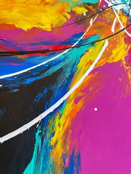A ogni pennellata, ho lasciato andare il controllo e ho seguito l'istinto. I gialli vibranti e gli arancioni accesi riflettono il mio desiderio di movimento e vita, mentre i blu e i bianchi più freddi portano l'equilibrio che cerco nel caos.