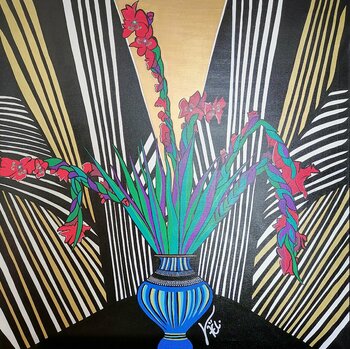 In questo lavoro ho combinato acrilico e Posca per catturare un'estetica simbolica sorprendente. L'eleganza di fiori vibranti emerge da un vaso dallo stile senza tempo, che si staglia orgogliosamente su uno sfondo dove linee dorate convergono verso l'infinito. L'insieme incarna un'audace celebrazione della vita e dà energia a ogni spazio, infondendo entusiasmo ed eleganza sofisticata.